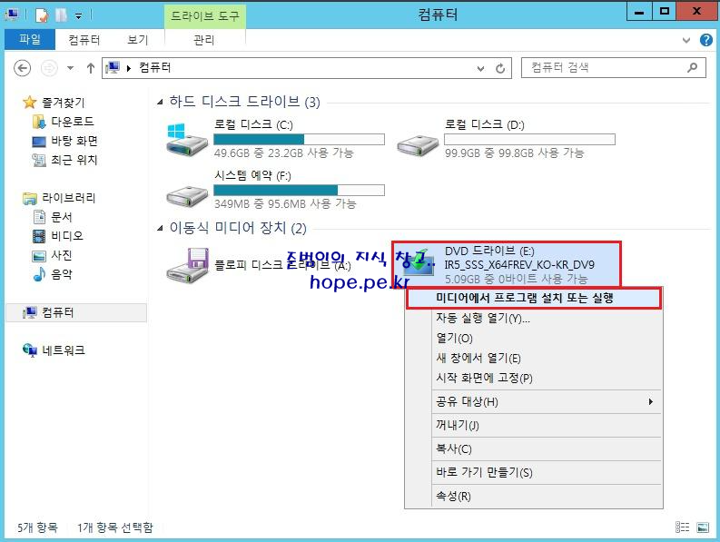먼저 Windows Server 2012 서버에 Windows Server 2012 R2 미디어 삽입 후 Widnows 탐색기 에서 DVD 드라이브 에서 우클릭 후 미디어에서 프로그램 설치 또는 실행 을 클릭 합니다.