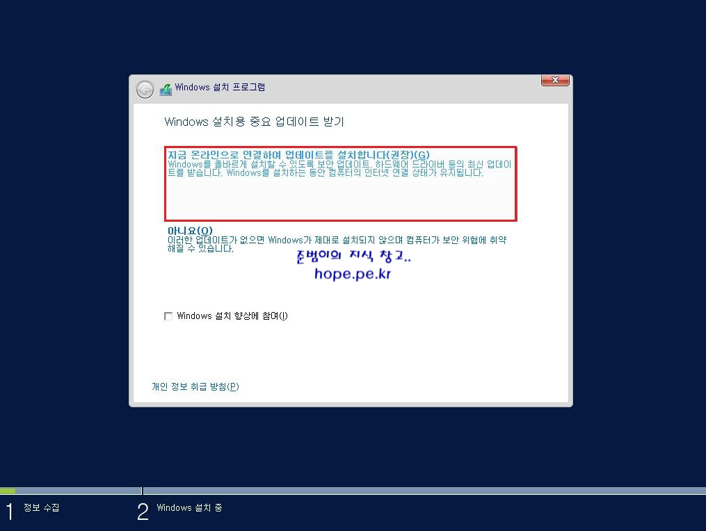 cf) Windows 설치용 중요 업데이트 받기 를 아니요 를 클릭 하였으면 다음 과정은 나타나지 않습니다.