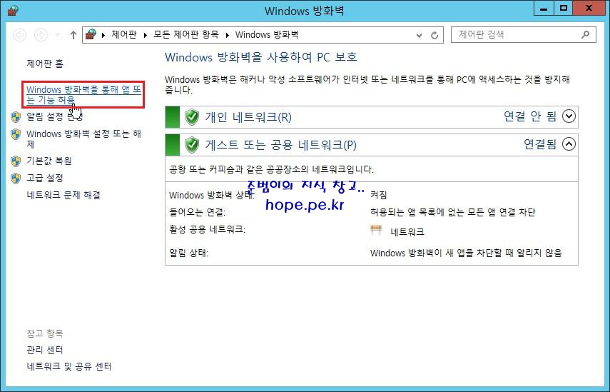 Windows 방화벽 창에서, 'Windows 방화벽을 통해 앱 또는 기능 허용' 을 클릭 합니다.