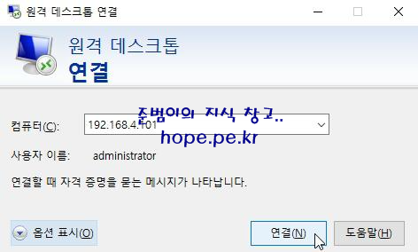 클라이언트에서 다시 원격 연결을 시도 하면, 사용자 자격 증명 입력 창이 발생하며 원격 연결이 가능 합니다.