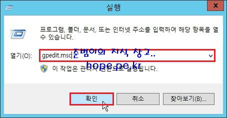 '실행 창 (윈도우키 + R키)' 에서, 'gpedit.msc' 입력 후 '확인' 을 클릭 합니다.