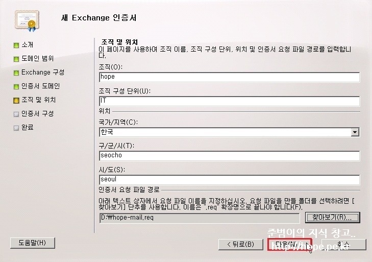 4. Exchange 구성 화면에서, 인증서에 사용할 주체 대체 이름 입력 후 다음 을 클릭 합니다.