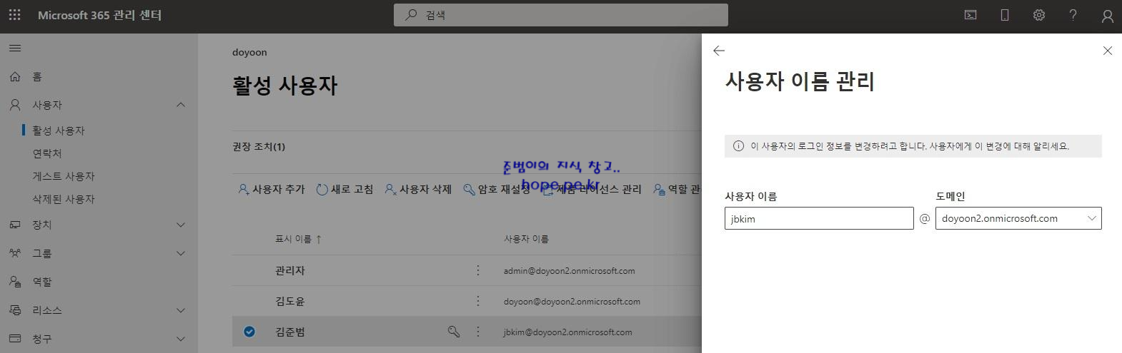 그리고 활성 사용자 화면에서, 사용자에게 hope.pe.kr 도메인 할당 역시 불가능 합니다.