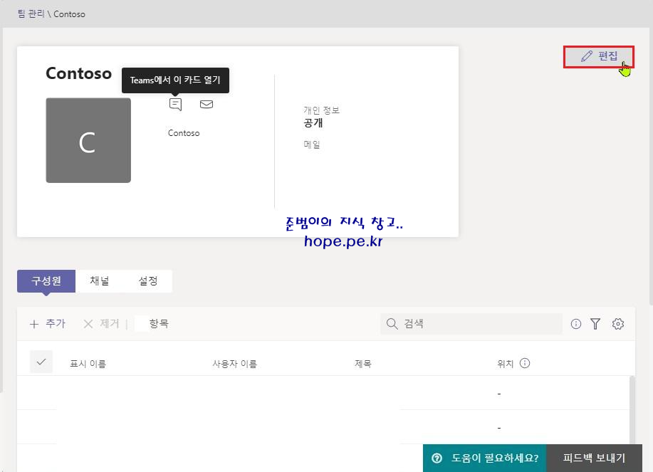 해당 팀 화면에서, '편집' 을 클릭 합니다.