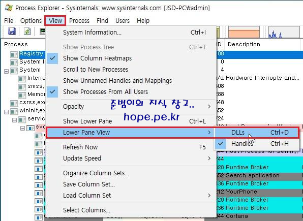 Process Explorer 가 실행되면 'View > Lower Pane View > DLLs' 를 클릭하여 옵션을 적용 합니다.