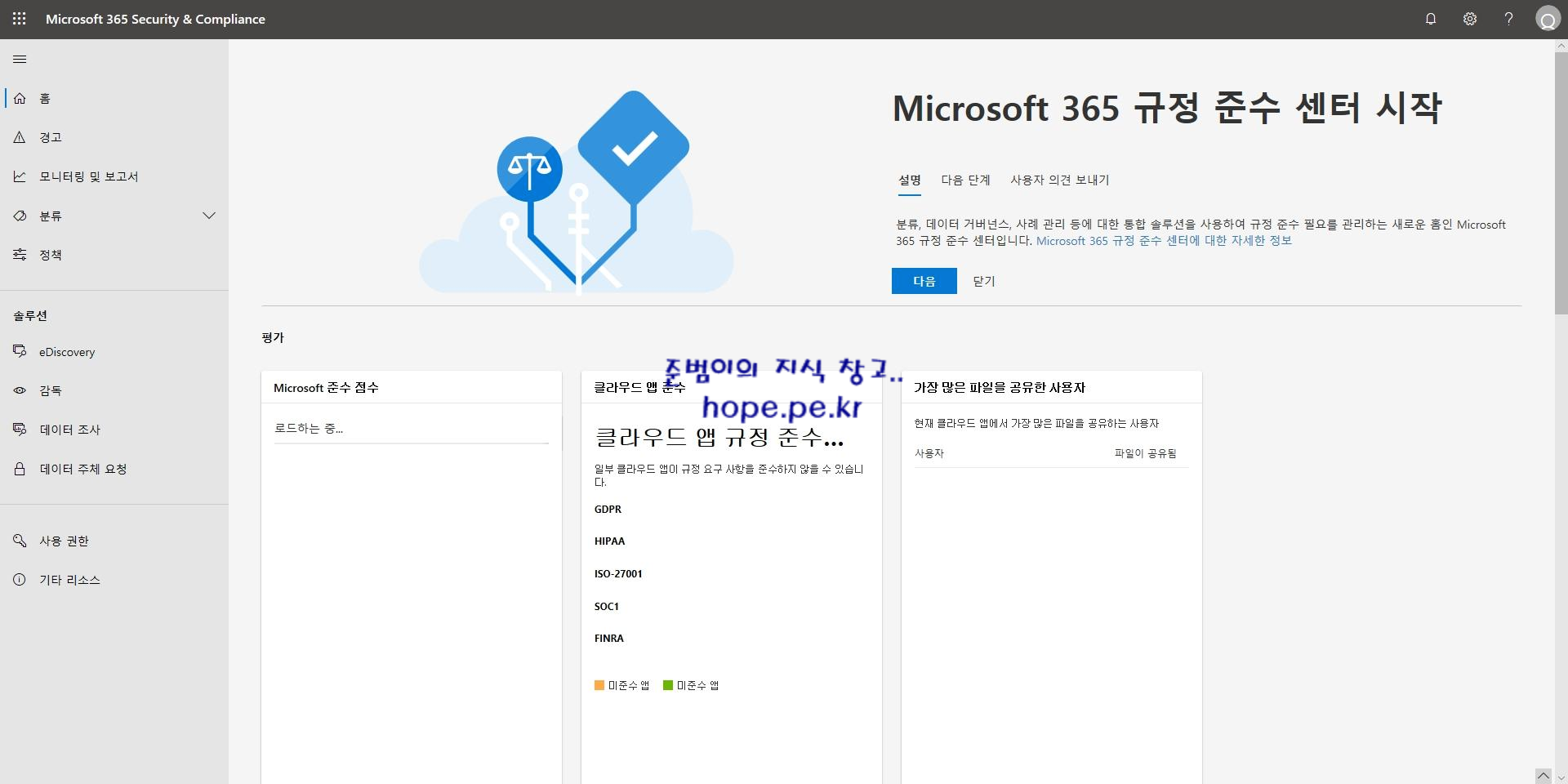 Microsoft 365 규정 준수 센터 화면 입니다.