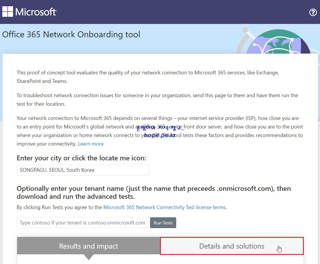 해당 Tool 을 통해 현재 위치에서 Office 365 에 접속 시 네트워킹에 이슈 여부를 점검해주고, 권장되는 네트워크 성능 개선 작업을 제안함으로 문제가 발생할 수 있는 근본적인 원인을 확인 할 수 있게 도와줍니다.