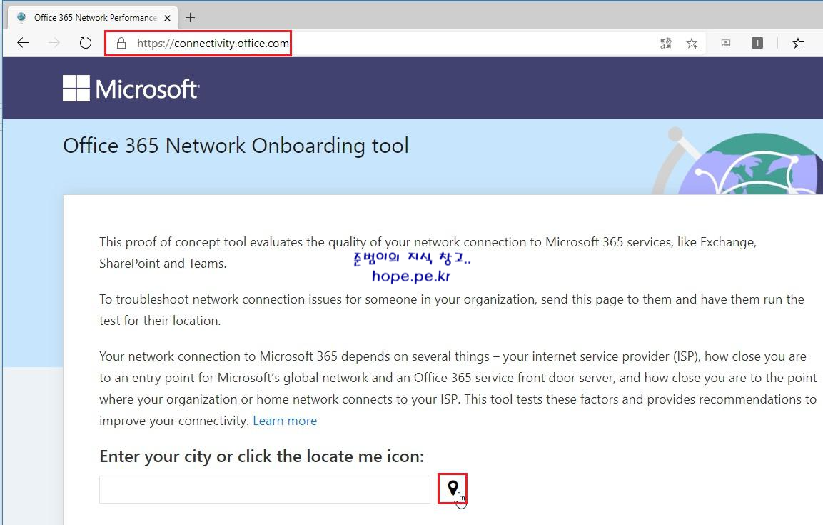 Office 365 Network Onboarding tool 사이트 (https://connectivity.office.com) 에 접속 후 '위치 버튼' 을 클릭 합니다.
