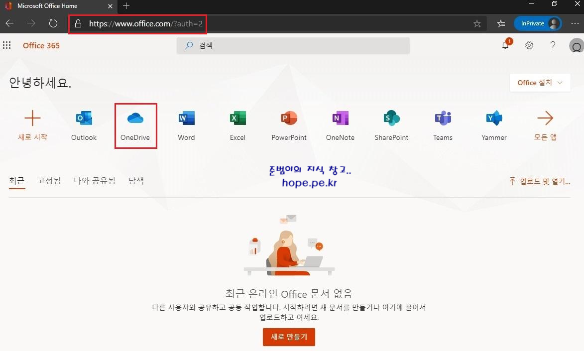 Office.com 사이트 에서 'OneDrive' 를 클릭 합니다.