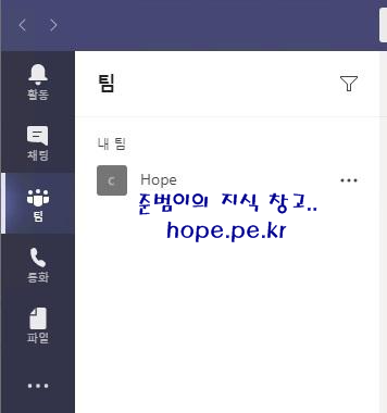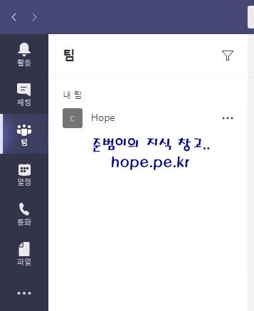 Teams는 아래 스샷과 같이 '활동 / 채팅 / 팀 /일정 / 통화 / 파일 / 더 많은 추가 앱(···)' 메뉴로 구성되어 있습니다.
