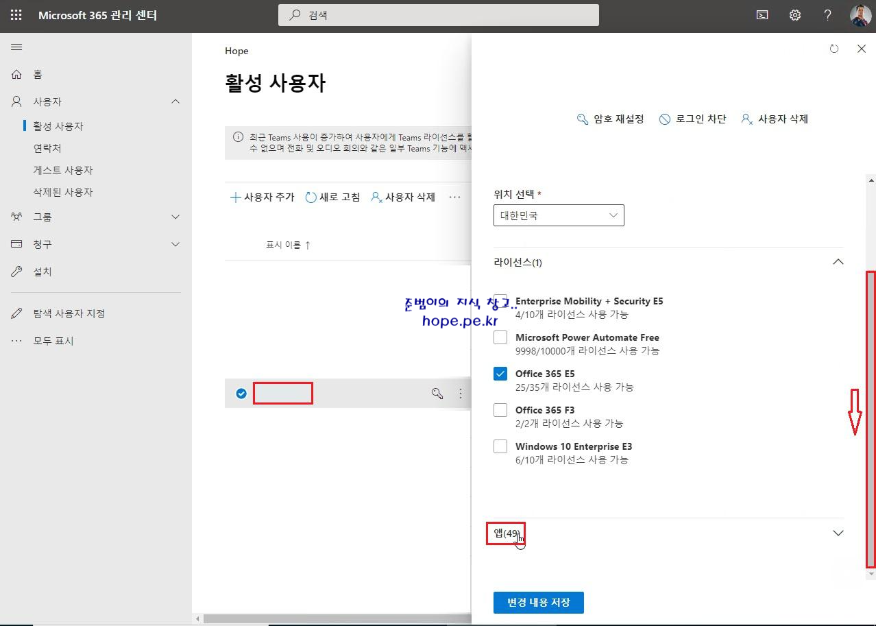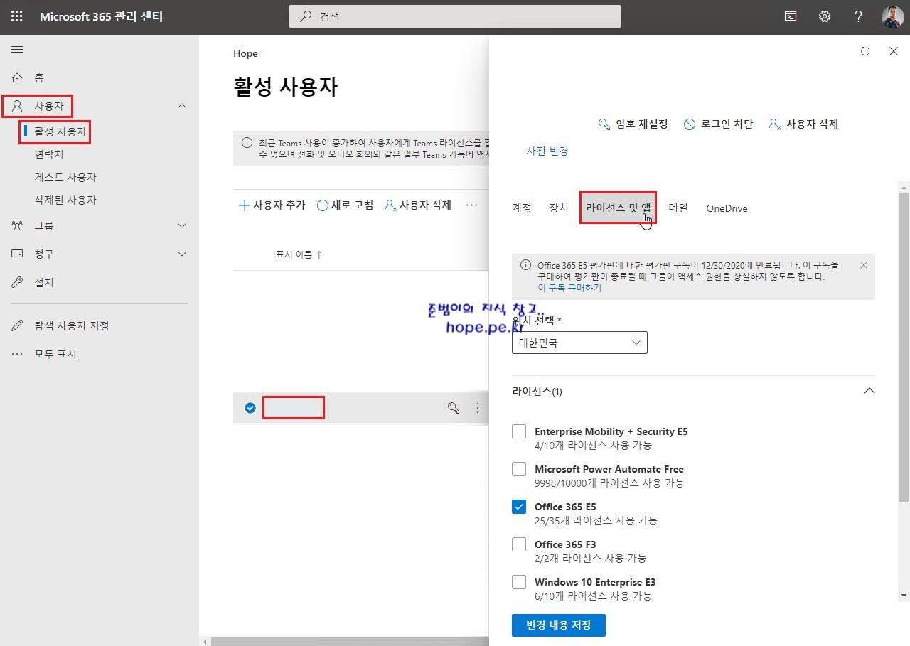 첫번째, 해당 사용자에 Exchange Online 라이선스가 없는 경우, 라이선스를 할당 합니다.