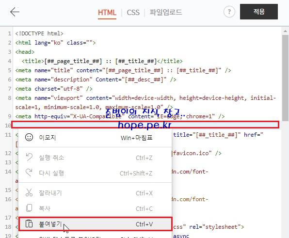 복사한 메타 태그를 <head> 태그와 </head> 태그 사이 적당한 위치에 '붙여넣기' 합니다.