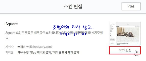 스킨 편집 화면에서, 'html 편집' 을 클릭 합니다.