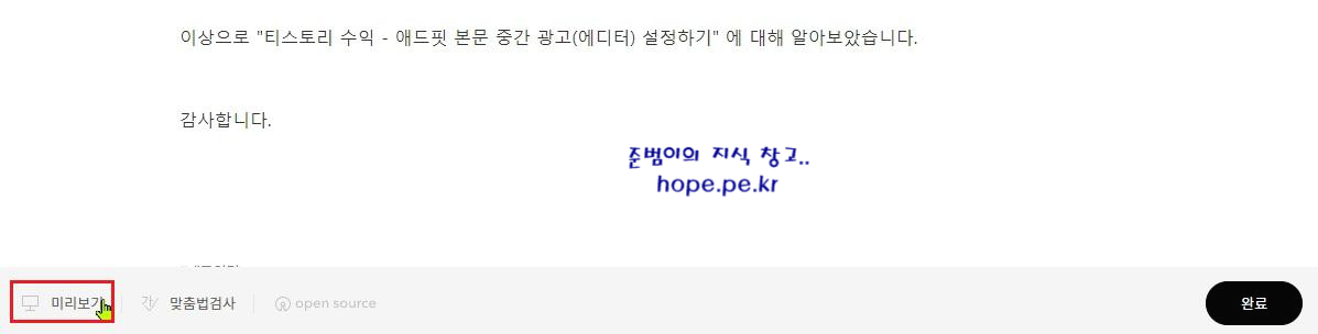 미리보기 화면에서, '애드핏 본문 중간 광고(에디터)' 의 위치를 확인합니다.