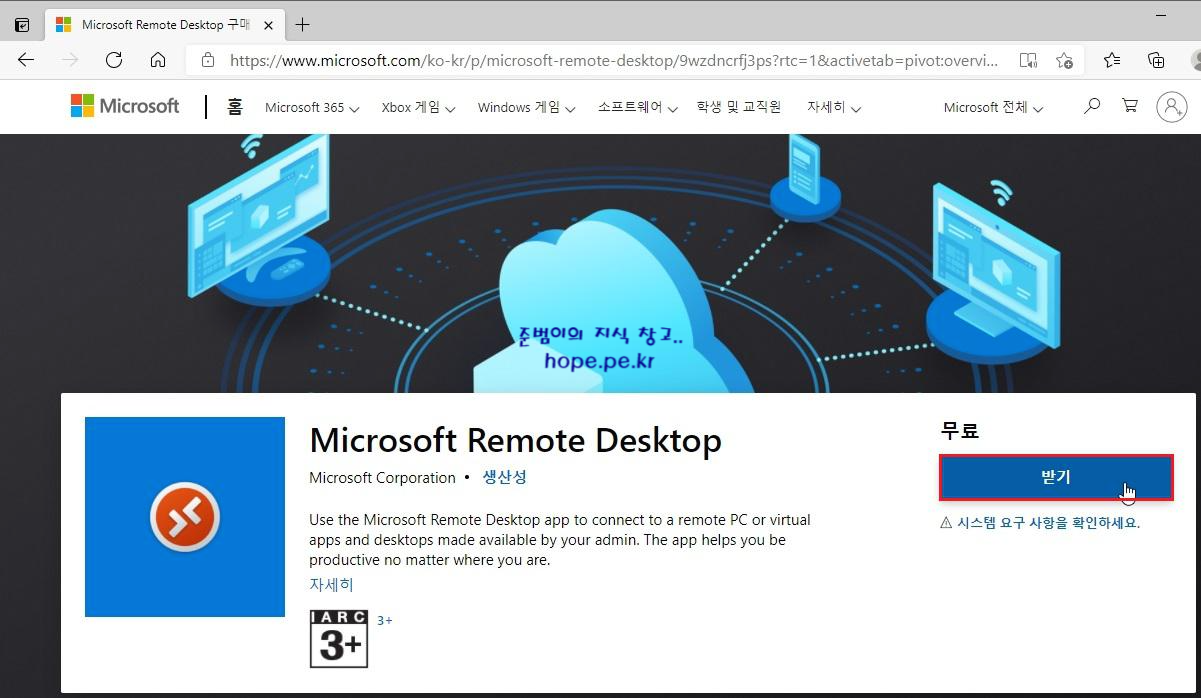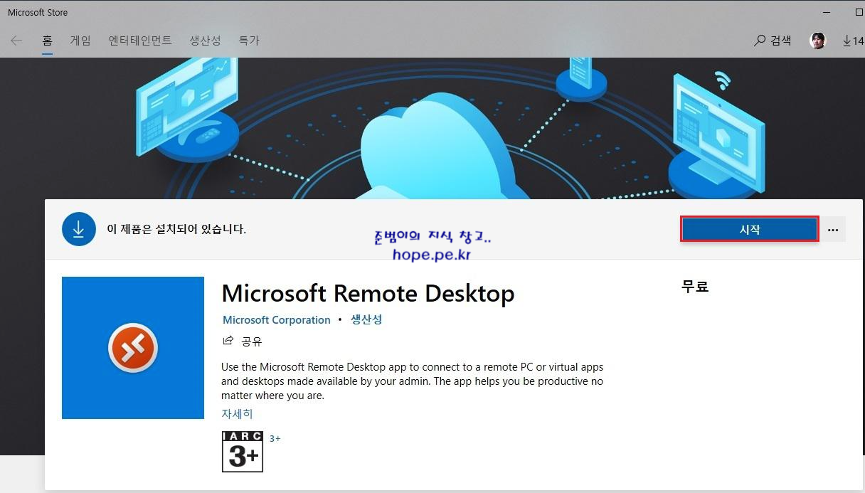 Microsoft Store 창에서, '받기' 를 클릭 하면 Microsoft Remote Desktop 앱이 설치 됩니다. 일정 시간 기다립니다.