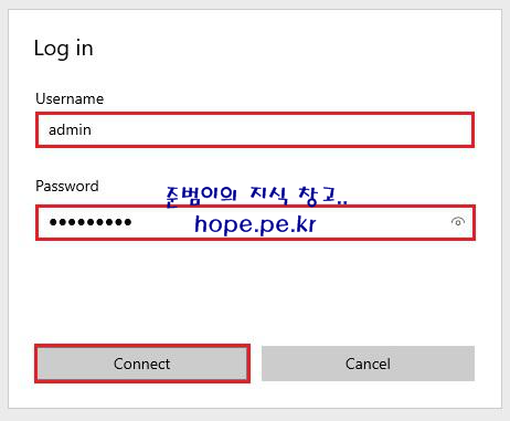 Log in 창에서, 'Username' 입력 후 'Password' 입력 후 'Connect' 를 클릭 합니다.