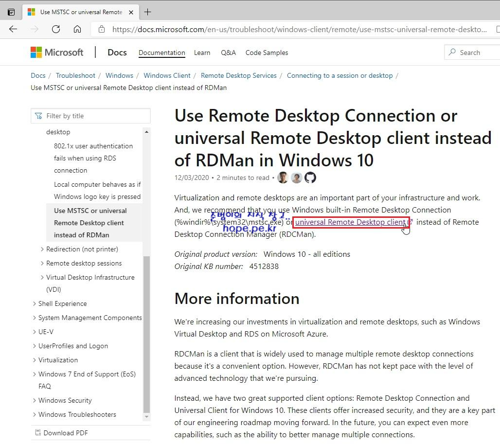 'Use Remote Desktop Connection or universal Remote Desktop client instead of RDMan in Windows 10' 사이트에서, 'universal Remote Desktop client' 를 클릭 합니다.