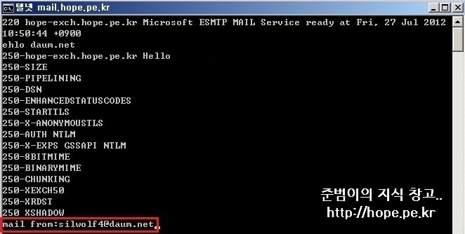 cf) 위의 예는 Exchange Server 의 응답 입니다. 타 벤더사의 SMTP 서버에서는 다른 유형의 응답이 나타날 수 있습니다.