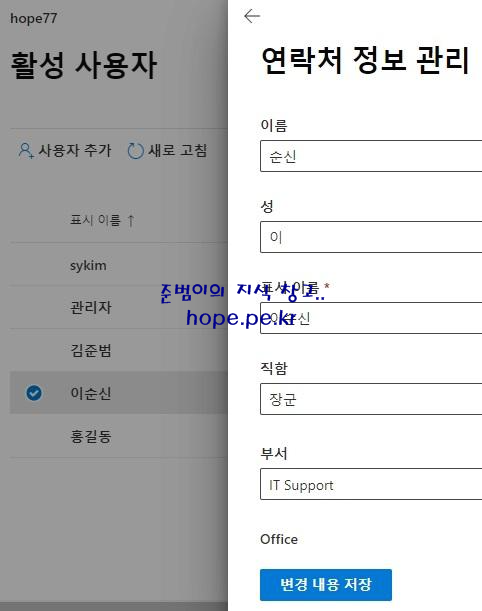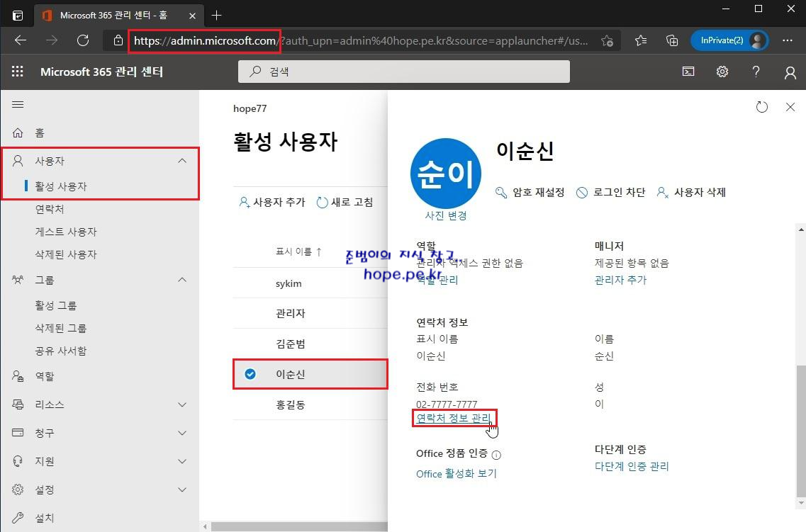 'Microsoft 365 관리 센터 > 사용자 > 활성 사용자 > 해당 사용자 > 연락처 정보 관리' 를 클릭 합니다.