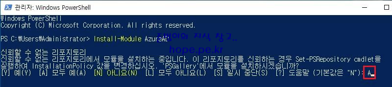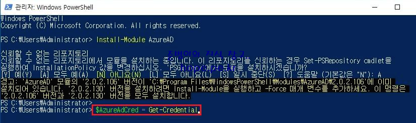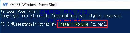 관리자 권한으로 Windows PowerShell 을 실행 후 'Install-Module AzureAD' 명령어를 실행 합니다.