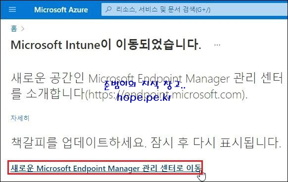 Microsoft Intune이 이동되었습니다. 페이지에서, '새로운 Microsoft Endpoint Manager 관리 센터로 이동' 을 클릭 합니다.