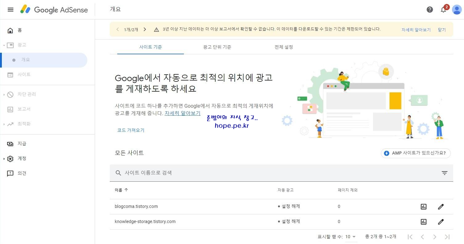 Google AdSense 개요 화면 입니다.