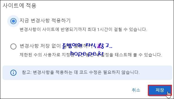 사이트에 적용 창에서, '지금 변경사항 적용하기' 선택 후 '저장' 을 클릭 합니다.