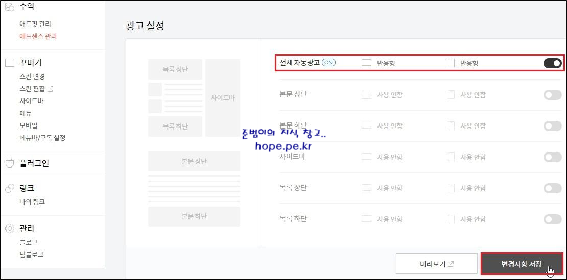 이번에는 '광고 설정' 을 '전체 자동광고' 로 설정 해보겠습니다. 다른 광고 설정 버튼은 모두 비활성화 하고 '전체 자동광고' 설정 버튼만 활성화 하고 저장 합니다.