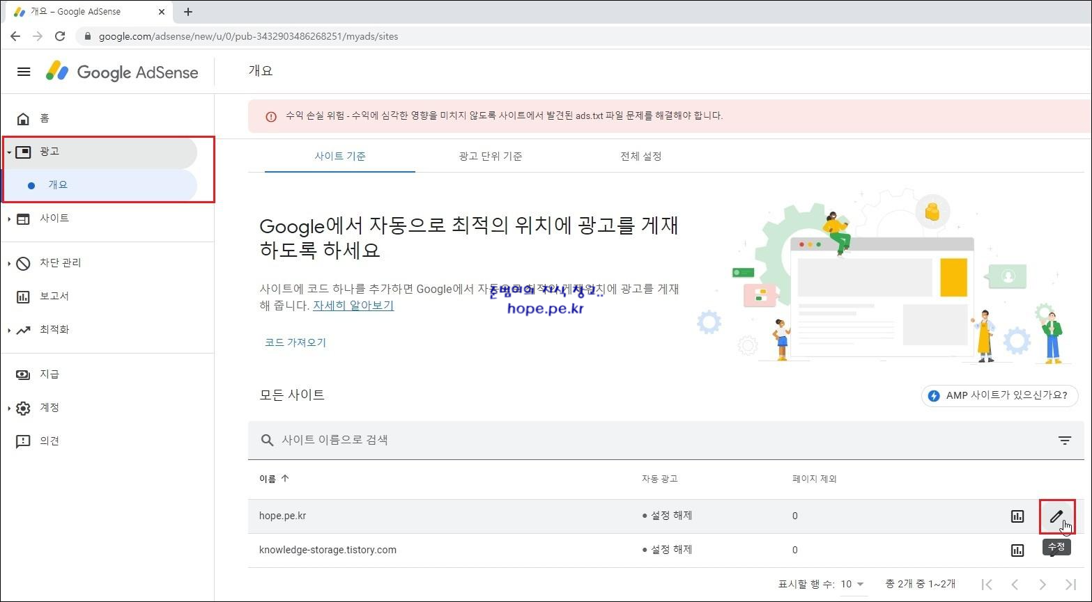 이에 Google AdSense 사이트 (https://www.google.com/adsense) 로 이동 후 '광고 > 개요' 메뉴에서, 자동 광고 설정을 원하는 사이트의 '수정 버튼' 을 클릭 합니다.