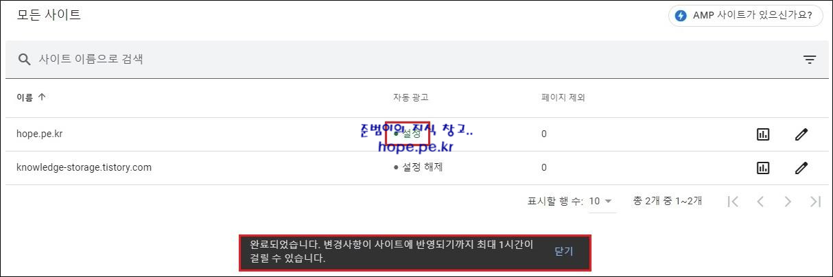 자동 광고가 설정 되었습니다. 그리고 '완료되었습니다. 변경사항이 사이트에 반영되기까지 최대 1시간이 걸릴 수 있습니다.' 메세지가 표시 됩니다.