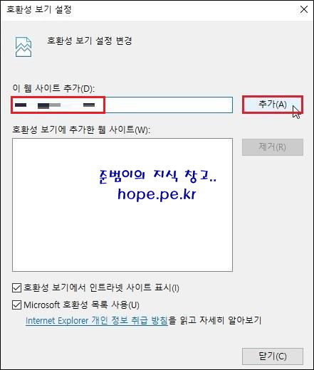 호환성 보기에 추가한 웹 사이트에 정상 등록됨을 확인후 '닫기' 를 클릭 합니다.