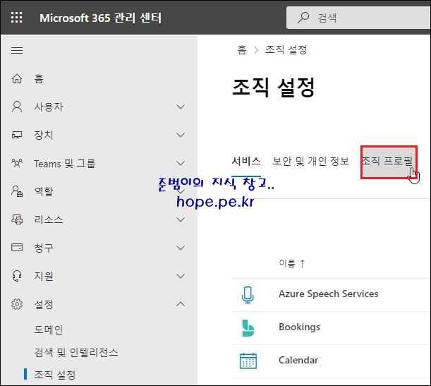 먼저 Microsoft 365 관리 센터 (https://admin.microsoft.com) 접속후, '설정 > 조직 설정' 을 클릭 합니다.