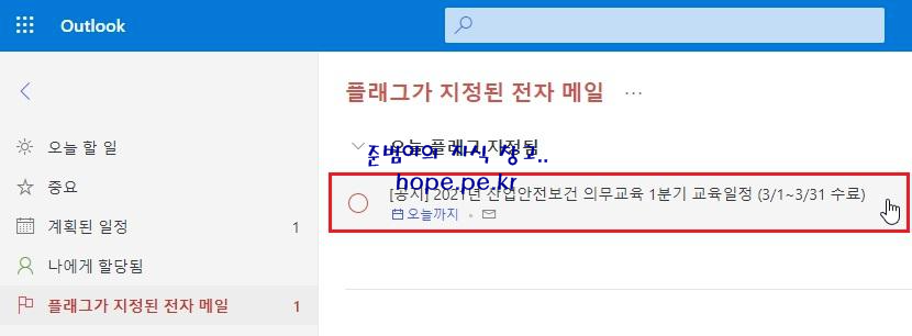 약간의 시간 경과 후 방금전에 Outlook에서 플래그 지정한 메일을 확인할 수 있습니다. 해당 메일을 클릭 합니다.