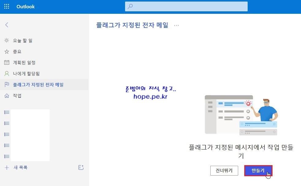 '플래그가 지정된 전자 메일' 메뉴를 사용하기 위해서, '만들기' 를 클릭 합니다.