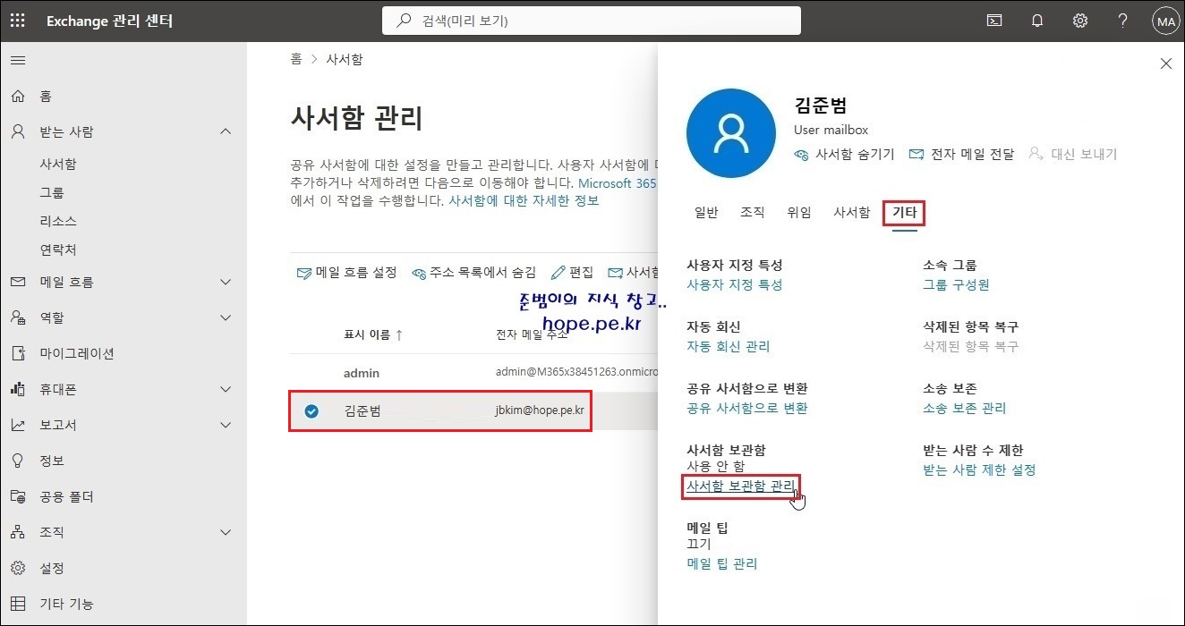보관 사서함에 대해 간략하게 설명을 드리자면, 보관 사서함이란 사용자의 기본 사서함 외에 별도의 보관 목적으로 사용할 수 있는 사서함 입니다.