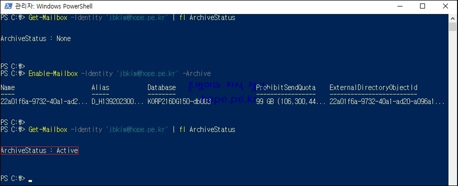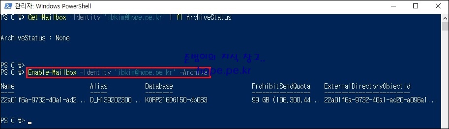 참고로 Exchange Online PowerShell에, 다음 cmdlet 명령어로 보관 사서함 사용 설정을 할 수 있습니다.