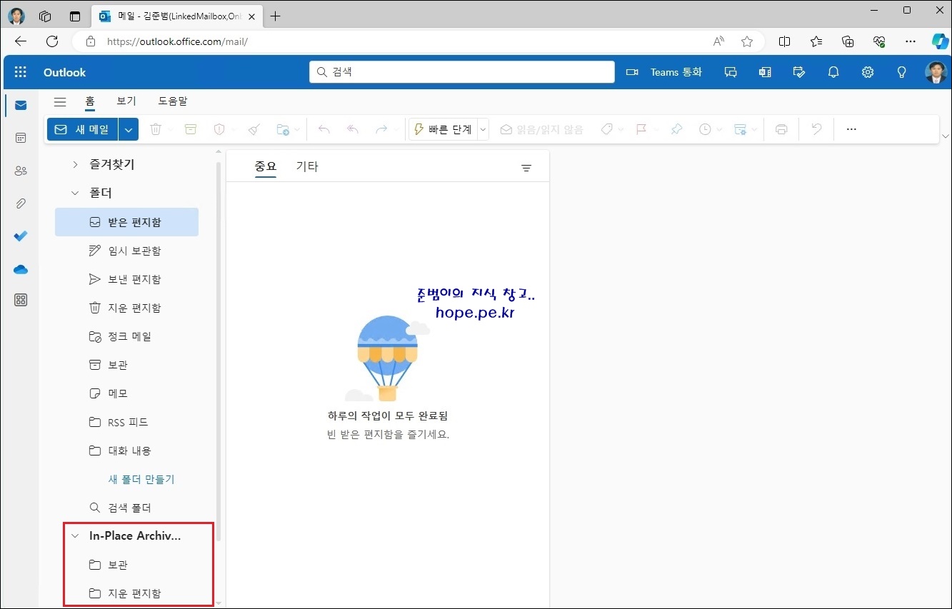 웹용 Outlook 역시, 기본 사서함 아래에 보관 사서함 'In-Place Archive - 김준범' 이 생겼음을 확인할 수 있습니다.