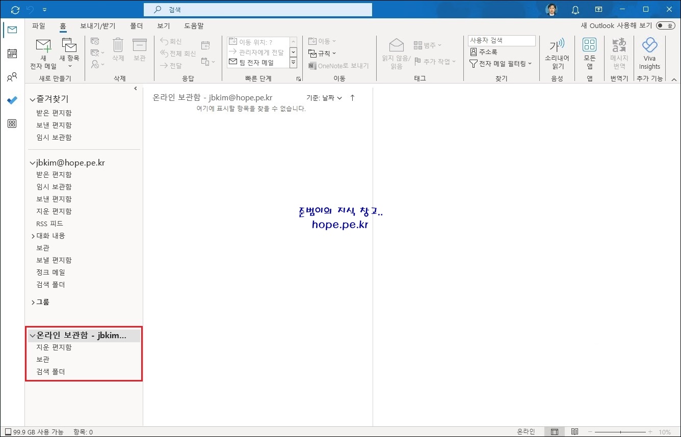 Outlook은 기본 사서함 아래에 보관 사서함 '온라인 보관함 - jbkim@hope.pe.kr' 이 생겼음을 확인할 수 있습니다.