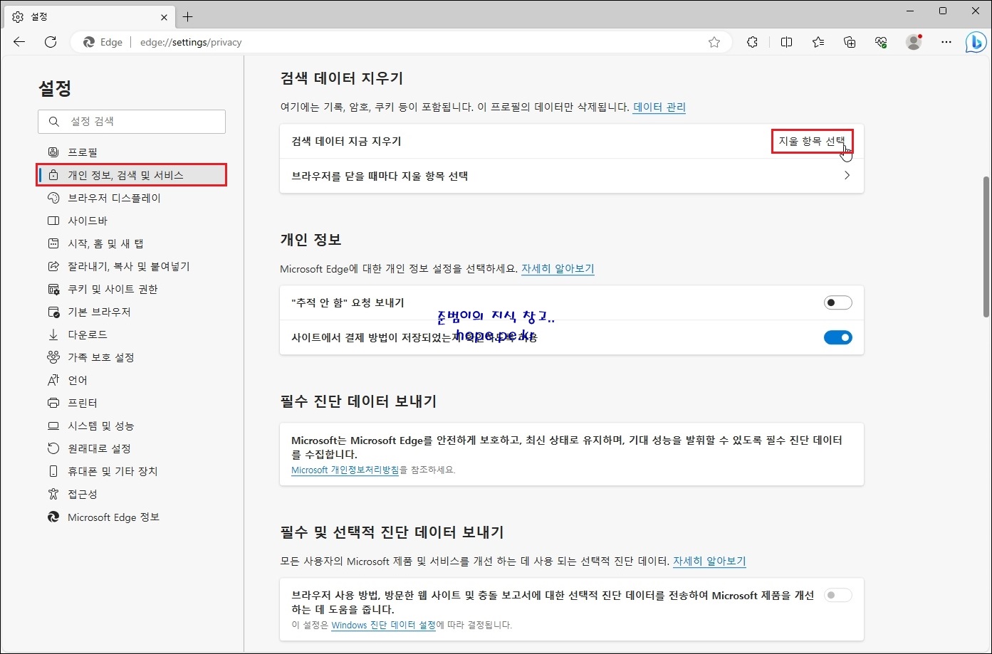 설정 페이지의 '개인 정보, 검색 및 서비스 > 검색 데이터 지우기' 에서 '지울 항목 선택' 을 클릭 합니다.