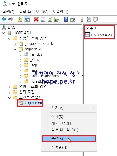 조건부 전달자가 정상적으로 추가되었음을 확인 후 추가한 도메인에서 우클릭 후 '속성' 을 클릭 합니다.
