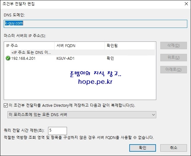 해당 IP에 대해 서버 FQDN을 정상적으로 불러오면, '이 조건부 전달자를 Active Directory에 저장하고 다음과 같이 복제합니다.' 옵션을 선택 후 '확인' 을 클릭 합니다.