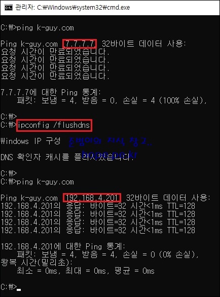 DNS 캐시 삭제 후 조건부 전달자에 추가한 도메인을 다시 조회해보면, 외부 DNS에 등록된 IP가 아닌 조건부 전달자에 등록된 IP를 조회해옴을 확인할 수 있습니다.
