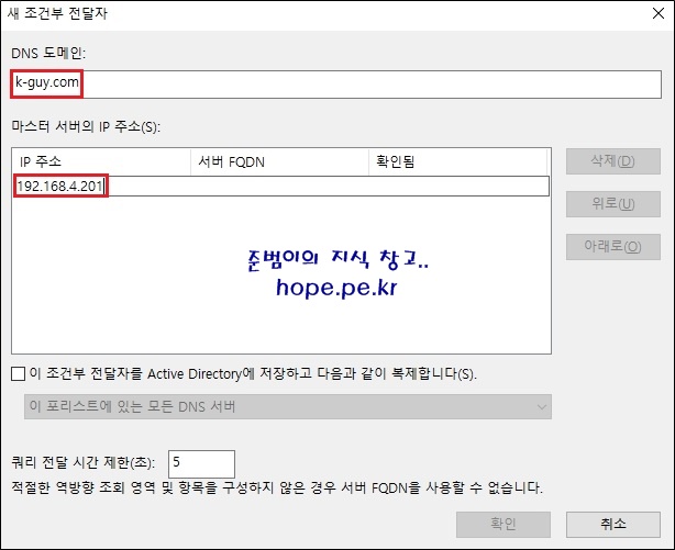 새 조건부 전달자 창에서, 'DNS 도메인' 입력 후 '마스터 서버의 IP 주소' 입력 후 Enter 키 누릅니다.