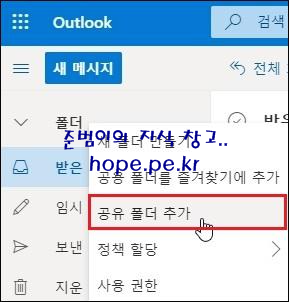 메일 내용과 같이 '왼쪽 탐색 창의 사서함' 에서 우클릭 후 '공유 폴더 추가' 를 클릭 합니다.