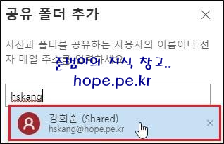 공유 폴더 추가 창에서, '공유 사서함' 입력 후 '검색되는 공유 사서함' 을 클릭 합니다.
