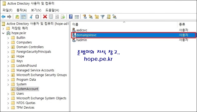 먼저 'Active Directory 사용자 및 컴퓨터' 콘솔을 실행하여 도메인 가입 권한만 부여할 계정을 생성합니다.