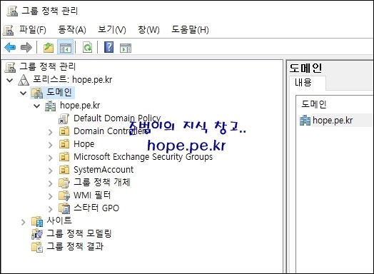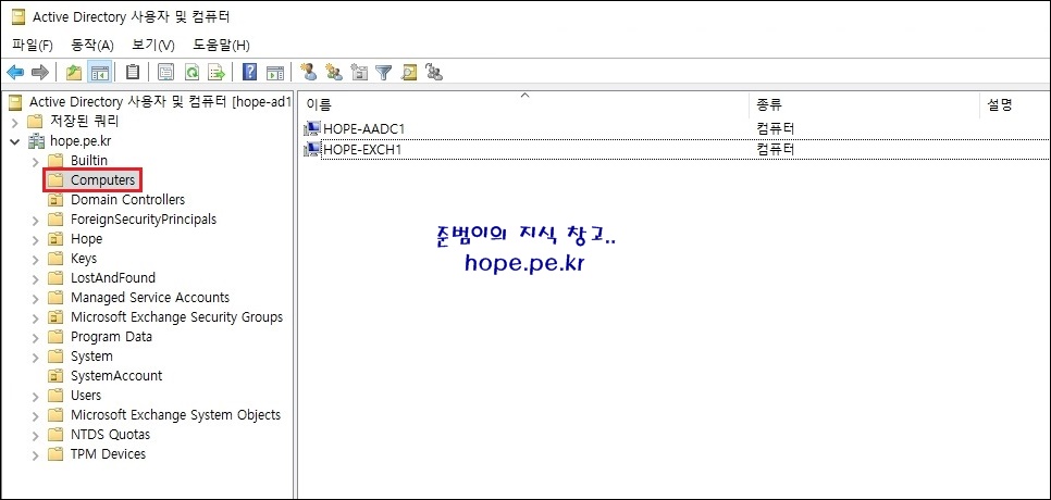 먼저 도메인 가입 컴퓨터 개체가 자동으로 저장되는 OU를 생성 합니다. 저는 'HopeComputers' 라는 OU를 특정 경로에 생성했습니다.