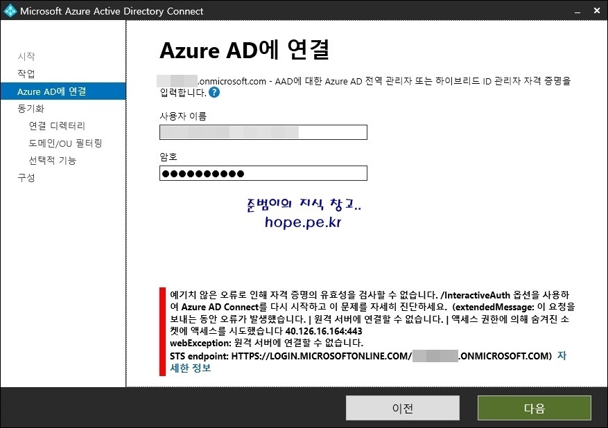 '예기치 않은 오류로 인해 자격 증명의 유효성을 검사할 수 없습니다. /InteractiveAuth 옵션을 사용하여 Azure AD Connect를 다시 시작하고 이 문제를 자세히 진단하세요. (extendedMessage: 이 요청을 보내는 동안 오류가 발생했습니다. | 원격 서버에 연결할 수 없습니다. | 액세스 권한에 의해 숨겨진 소켓에 액세스를 시도했습니다 40.126.16.164:443