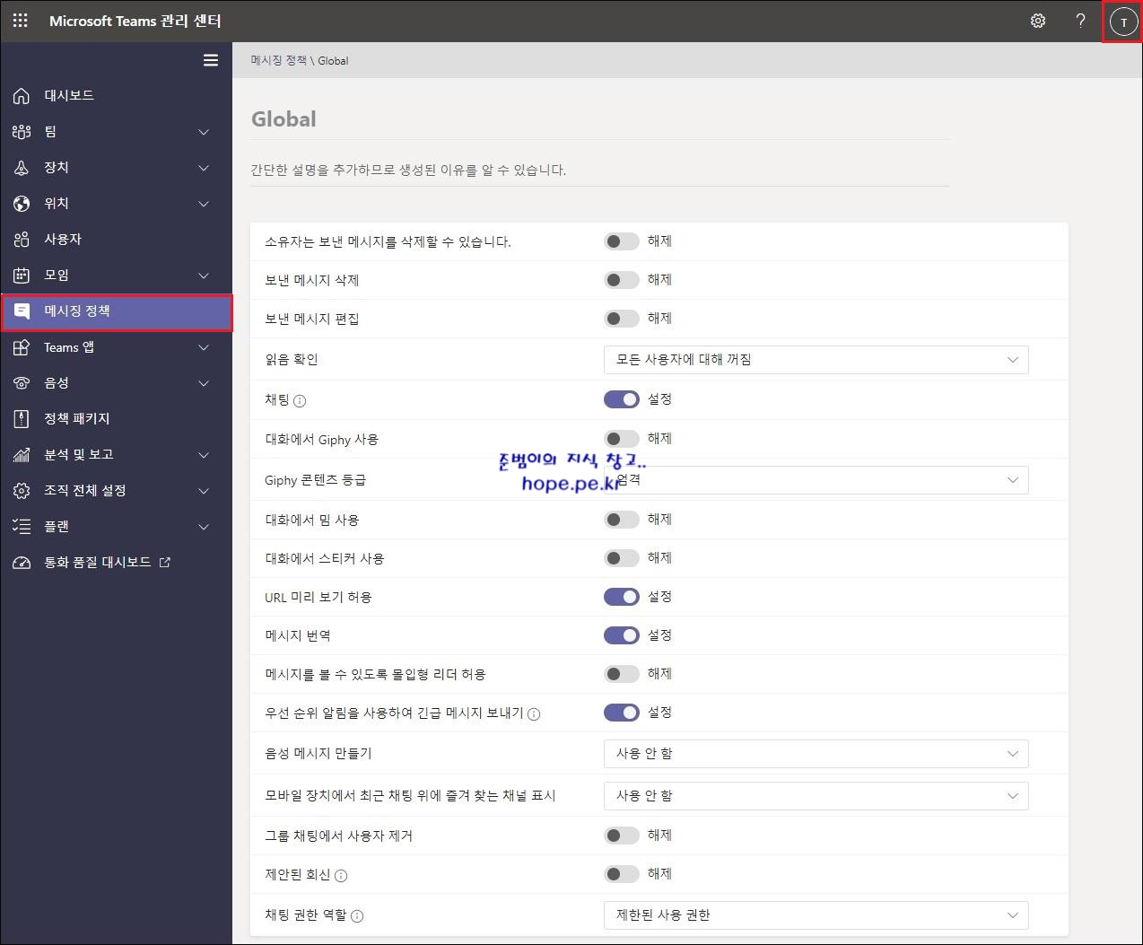 참고로 원본 테넌트 메시징 정책 화면 입니다.