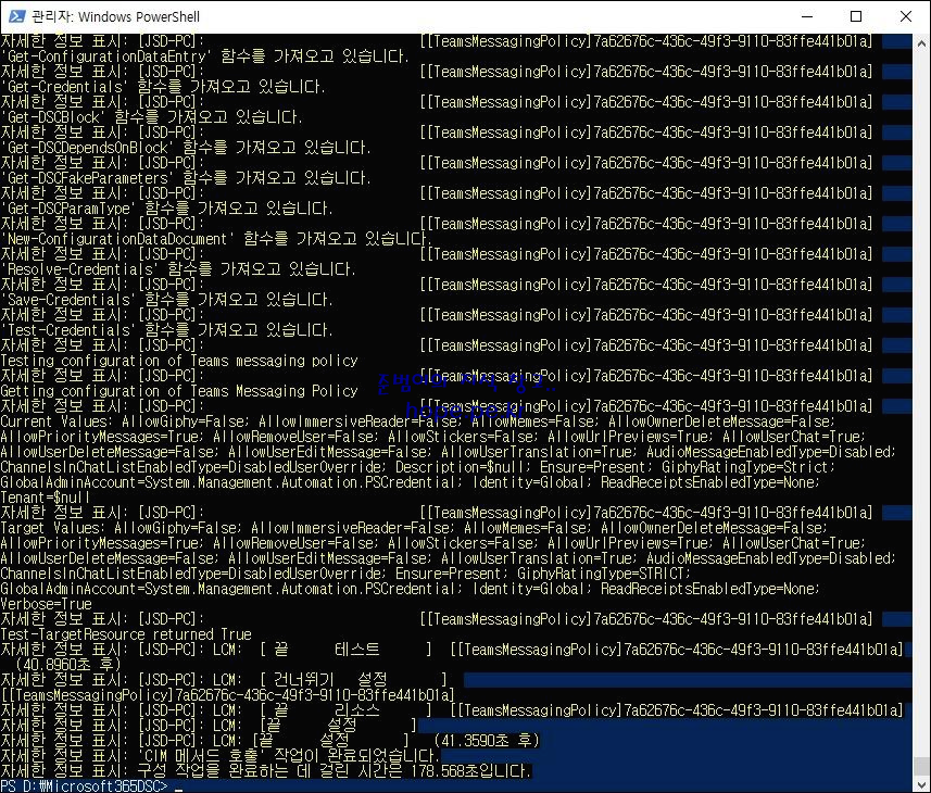 'Start-DSCConfiguration M365TenantConfig -Wait -Verbose -Force' 명령어로 원본 테넌트의 TeamsMessagingPolicy 설정을 타켓 테넌트에 동기화 합니다.